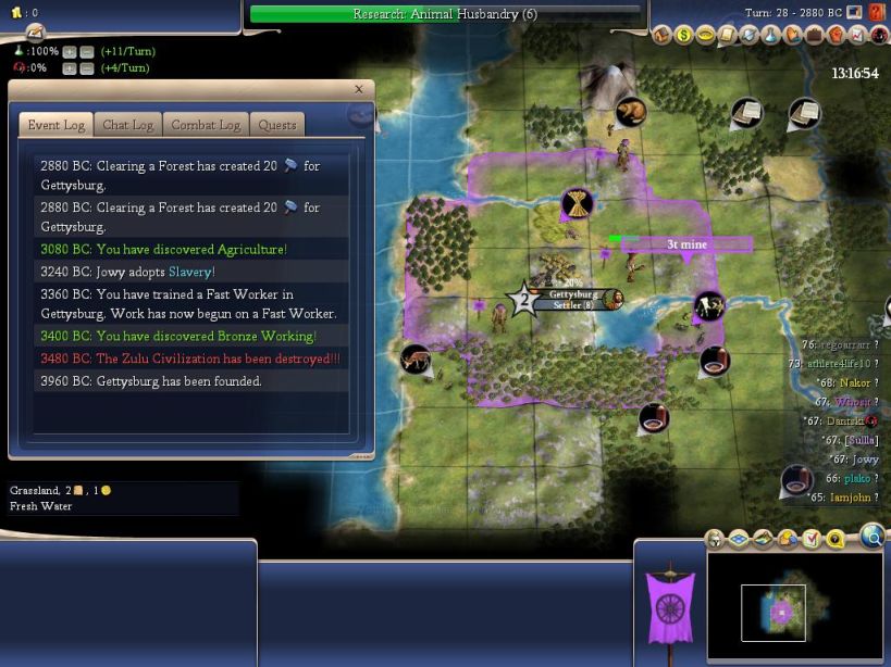 At this point, we had two cities, two workers, three warriors, and two improved food bonus tiles. We were the first team in the game to found a second city, and as best I can tell from reading the other spoiler threads now after the game's conclusion, we were the only team with two workers. (Remember, most everyone else started on the coast and went for a work boat at some point.) Jowy had the misfortune to lose a scout and his first warrior to barbarians, and had to slow his development further to train replacement warriors. Dantski had teched Hunting and Archery, and was training a few skirmishers for some reason. (Impregnable defense in cities, but a slow start from a growth perspective.) We had Bronze Working and Animal Husbandry techs, with both copper and horses visibile and in range of our current cities. Our two neighbors were friendly and showing no intention of acting aggressively towards us.