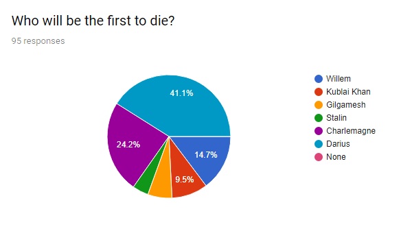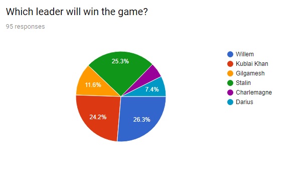 Eauxps I. Fourgott: Kublai Khan is a complete fraud, who gets by on lucky breaks time and time again to continue advancing and has deserved none of his championship appearances. I expect him to properly be first to die here yet again. In fact, almost everybody here has played poorly and/or had lucky breaks to get this far: Gilgamesh, Kublai, and (to a lesser extent) Charlemagne were lucky to advance past the opening round. Stalin was lucky to survive the playoff round and get chosen by Gilgamesh to advance over Shaka. Darius prospered from long years of peace and threw away a certain victory in the playoff round. Out of these six leaders, Willem has by far the most impressive resume this season, with a second place finish with the top score in the opening round, and a win while beating back a 2v1 war in the playoff round. He's needed the least lucky breaks of any of the leaders, and to make his situation even better he has a nice middling peace weight that will prevent any of the other leaders from instinctively hating him too much. This is Willem's game to lose. To round out my predictions, I'm picking Charlemagne to have yet another impressive game that still falls short of the win for second place, and a cultural victory as a realistic Willem choice that would continue the pattern for victory conditions in championship games.