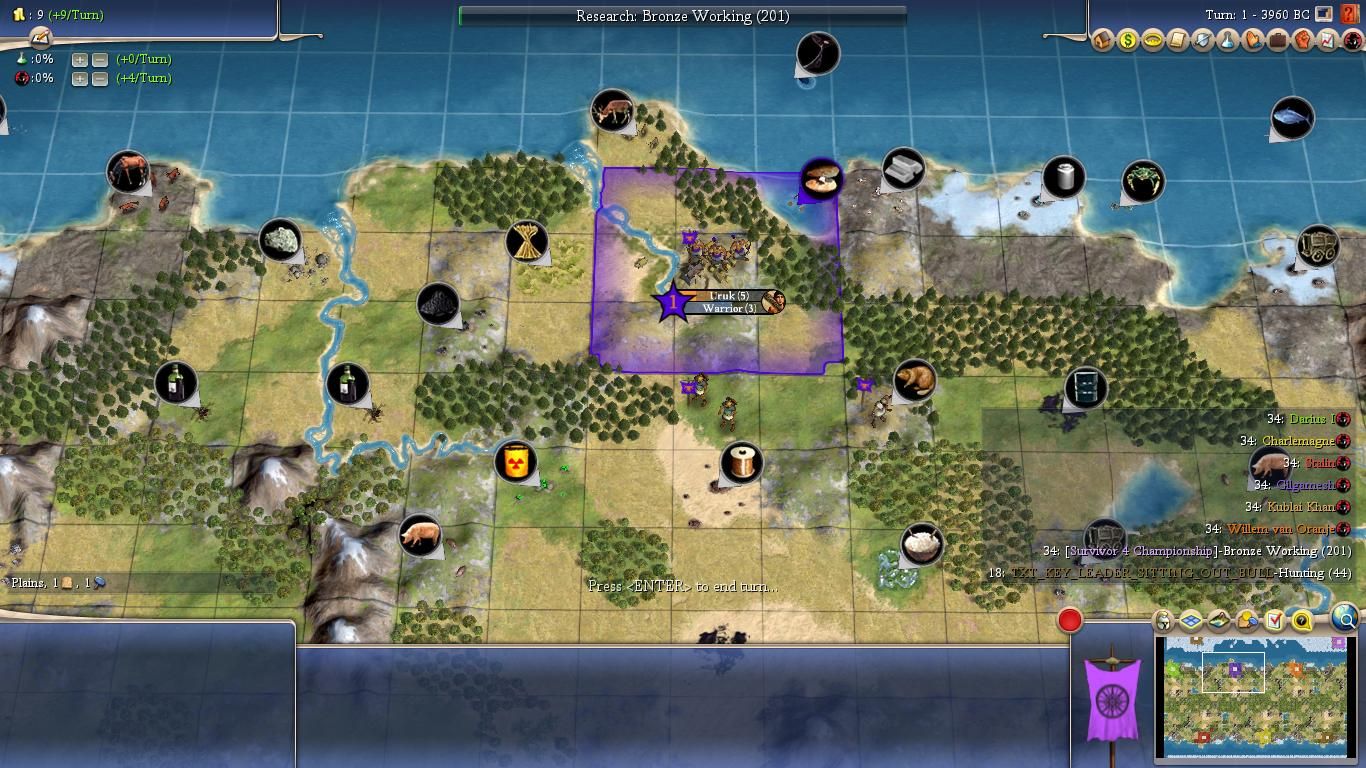 Note that the terrain is again mirrored here, with the Calendar-based happiness resources in the center of the map located at the same distance from each capital city. Commodore did not run any rivers through the center of the continent and it could be some time before the AI leaders manage to tame the wilderness in there. Expect the northern and southern sides of the map to remain divided from one another during the early turns of the game.
