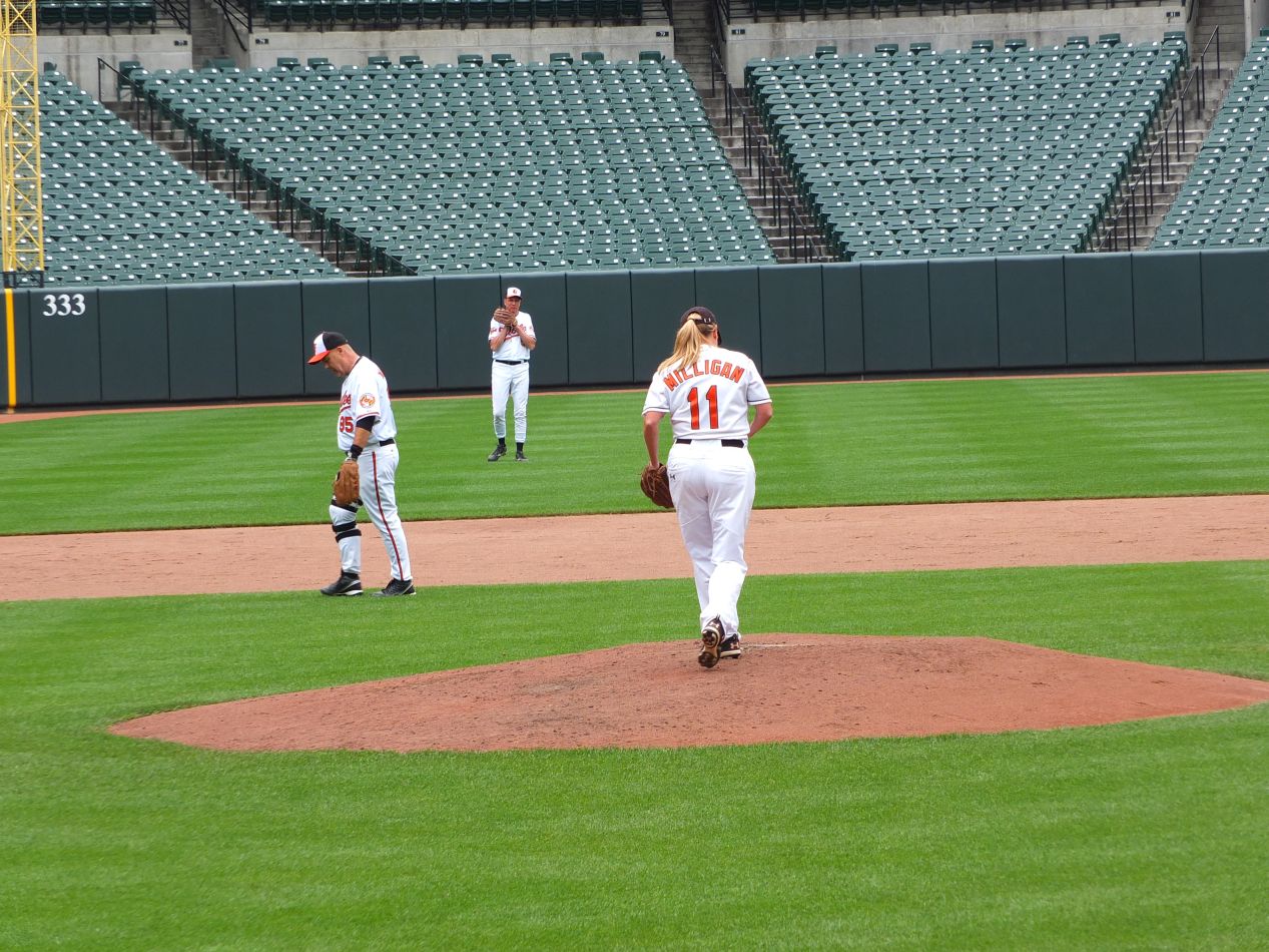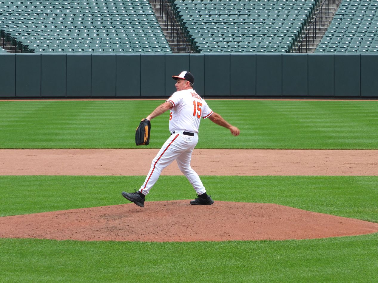 The Dream Week participants were almost entirely men, and the event is geneally geared around the assumption that the participants will be male. However the Orioles do allow women to take part if they're willing to pay the hefty entry fee, and the Dippers had one woman on their team. Milligan pitched for an inning, batted, played in the field, and was generally indistinguishable from the other amateurs on the roster. She looked like she was having a lot of fun from what I could tell. Most of the players didn't particularly stand out in terms of talent, but one exception was the guy named Tindal in the pictures above. He pitched for two innings and completely shut down the Dippers, throwing in the mid 80s and tossing the baseball right past the batters on my dad's team. It was a stark contrast between the other amateurs out there who were pitching in the 50s and 60s and then a fireballer coming in and tossing that much faster. The Dippers never had a chance.