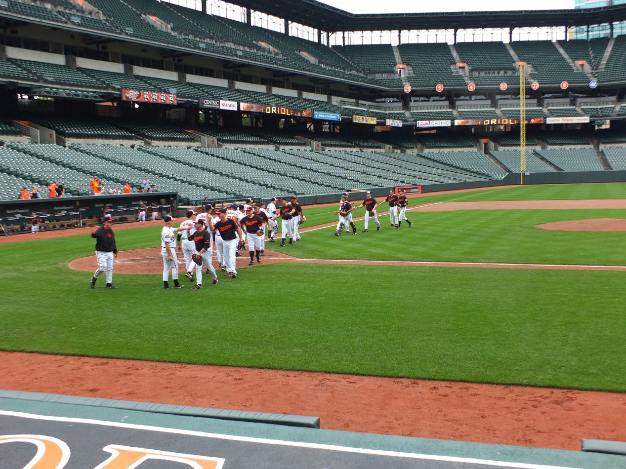 When the reunion game took place in June, our whole extended family came to see the action take place. My cousin and her kids drove down to show their support while my brother flew in from Chicago for the weekend. One of the best things about the Dream Week event is the chance to play this reunion game in Camden Yards itself, one of the most beautiful and iconic venues in which to watch a baseball game. This event is open for anyone to attend free of charge, although in practice it's pretty much just the families and friends of the Dream Week participants who show up. I've been to Camden Yards many times before, but rarely on an early Satuday morning with the stadium devoid of visitors. It's bizarre to have about 200 people sitting in the seats of a stadium that can accomodate 40,000 fans. On the plus side, we were able to sit anywhere that we wanted in the lower deck and enjoyed perfectly clear views of the field.