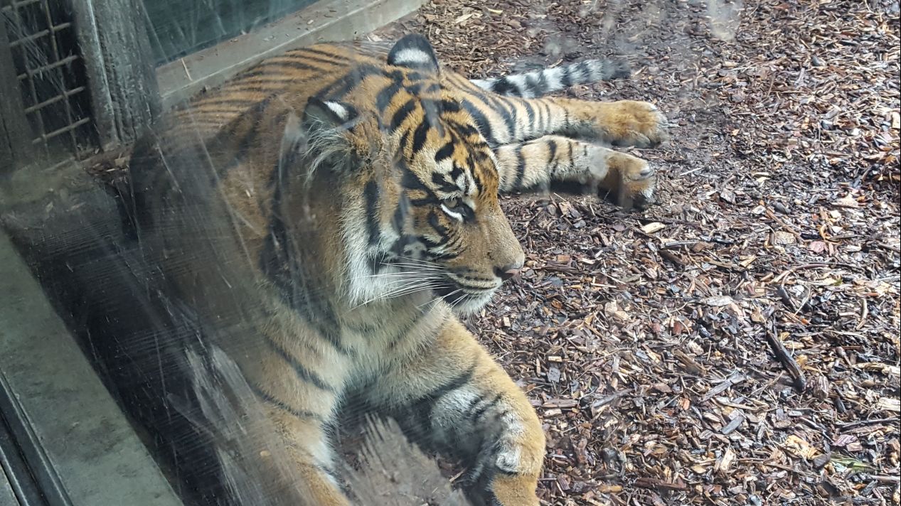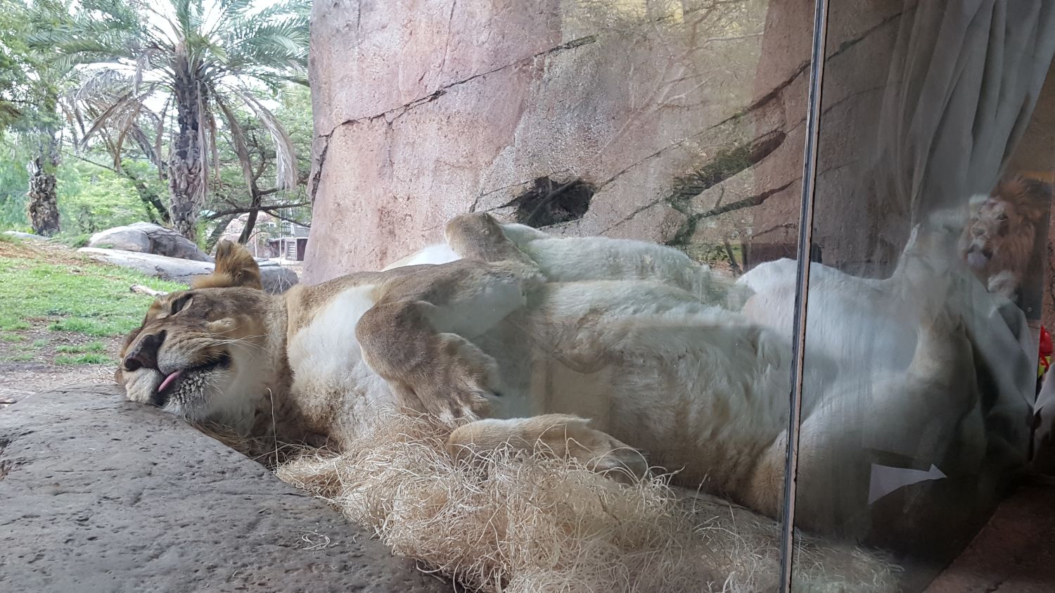 Of course I had to see the lions as well before heading off to the caravan tour. There was a small pride of them in their enclosure, and while none of them were up and about, they were all sleeping right next to the glass. The Safari Park employees craftily put their sleeping area with sawdust right up against the viewing glass to make sure that the animals would be visible while sleeping. I was amused at how the lionesses slept upside-down on their backs, with their paws flopping down to the side in silly fashion. The male lion was reminscient of our dog Sidney, who likes to sleep in exactly the same pose with his head laying on a pillow. I was also able to take this picture: