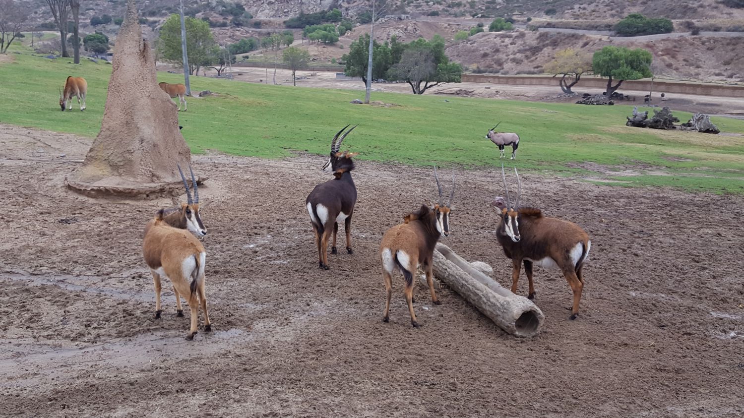 That was the last animal enclosure that I had time to visit before needing to head over to the caravan tour. There's a cheetah racing demonstration that takes place at the Safari Park that I would have loved to see, but it wasn't even happening on this day due to the poor weather. The caravan tour is not included in the cost of admission to the park, and this two hour trip that I had booked in advance was running me another 120 dollars (in 2018 pricing). It was worth the expense, however; how often do you get the chance to drive right up to herds of exotic animals in a natural environment? There were only ten other people on this caravan tour, all of them part of a group from Boston that worked for a pharmaceutical company. It was the ten of them and then me by myself, so I stood out a bit from the rest of the tour group. Our tour guide had been doing this job for many years and had a very laid-back approach, answering questions as asked but otherwise mostly getting out of the way and letting everyone enjoy themselves. Our vehicle drove through a series of gates out into the safari area, which let to several comments about how this felt like entering Jurassic Park... only to hear from the tour guide that Steven Spielberg and some of the other producers had come to the Safari Park while making the film and based a lot of what was in the movie on how things operated here. In other words, this legitimately was like going through the gates at Jurassic Park, they drew inspiration from this place!