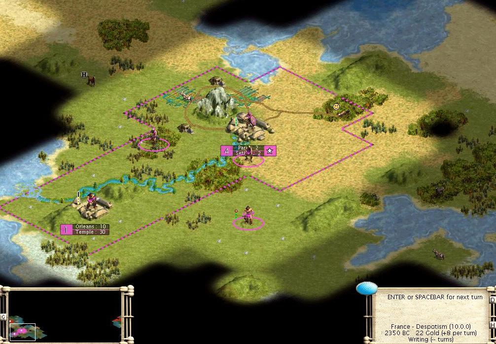 Orleans has just been attacked by barbarians in this picture, and it would be attacked again later. I found a perfect rhythm for Paris and settler building: it would build a settler at size 5 and shrink to size 3. Then it would build a warrior (2 turns) and take 2 turns to regrow to size 4. Then it would build a settler (4 turns) and take 4 turns to grow to size 5, at which time it would shrink back to size 3 again. I wasted some shields on the warrior build, but overall it was extremely effective at producing warrior/settler pairs. And notice two workers building a road in the forest to connect Paris and Orleans? Those I bought from England, after checking both England and Babylon every turn to buy workers. They were immensly helpful early on, and their loss crippled England's growth. And I got them for free too, or nearly as the money to buy them came from sacking barbarian camps.