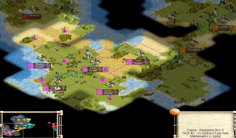 Well, I continued settling at this point. I was pumping out settlers very quickly from Paris, while all the other cities were mostly building temples or military or workers. It worked well, because by the time that I took my next screenie in 1625BC I had as many cities as any AI civ and was beginning to pass them. Sometime after I got Writing, I traded (and brokered) contact between civs and thus came to know about the Americans, the Iroquois (yellow in this game, oddly), and the Indians. When mapmaking became available, I similarly traded for everyone's world map and raked in some gold. But this was not as crucial in this game as it was in my Deity game, since I was still on an even footing with the rest of the world. Here was the world in 1625BC, with much of the total map revealed: