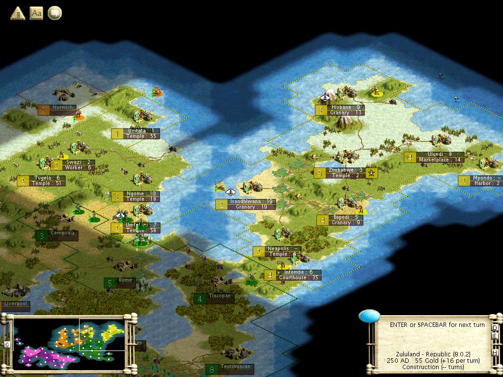 A few notes for this map (sorry that it's a full screen one, but I wanted to show the full extent of my territory at the time.) I had avoided building more fishing towns on my home penninsula due to the overlap between Intombe and Neapolis, as well as that between Swazi and Tugela. I didn't want to increase the corruption in my existing cities by putting new almost useless ones so close to my capital (having more cities increases the corruption in all of your cities). Maybe it was foolish, but I was delaying infrastructure in Zimbabwe for too long anyway, so I stuck with that decision. Neapolis and Intombe shared tiles like crazy, but could both get a couple of shields and be productive. Ngome was my planned Forbidden Palace city; it was already getting 2 shields/turn without a courthouse and also contained both horses and iron. Definitely a valuable site. Swazi and Tugela were founded where they were to minimize overlap with the English cities and share the numerous good tiles around them. I also set Swazi to become a worker factory, which helped to minimize overlap. Umtata was of course another fishing town. And Umfolozi, which is almost obscured by Aztec units moving by, was founded to get a few more tiles close to the Forbidden Palace city and to rush a harbor. I rushed one there to keep the cities across the bay happy with the luxuries that my core cities had. Naturally all my cities are on a bigtime infrastructure push at the moment. Things were going pretty nicely.