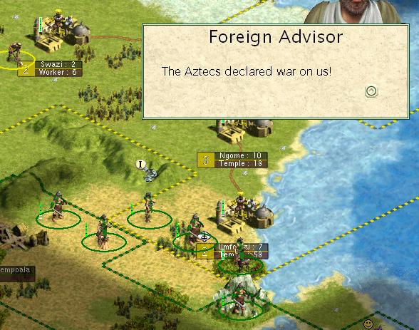 But look more closely at the picture. There really ARE a lot of Aztec units outside Umfolozi, and that means trouble. I took this picture at the end of a play session, so imagine my shock when I opened up the game the next time I sat down to play and got this message between turns: