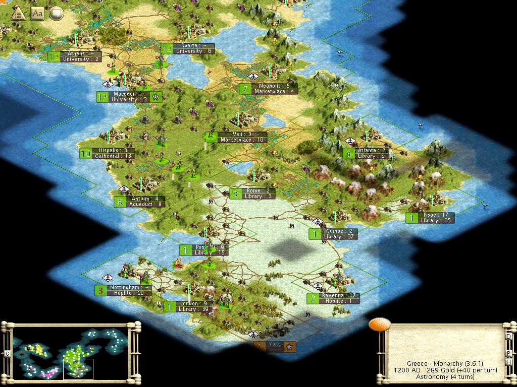 The starting continent was mine at last, and the age of sail was now upon me. Before I go any further though, I will provide a map of the southern regions of my continent, snapped in 1200AD just before the English were ejected from their last city: