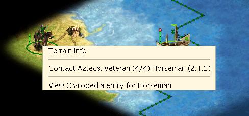1400AD was an important turn for the game, as a number of things occured that would have highlighted any other turn individually. For starters, Smith's was completed manually in Delphi thanks to a longtime Leo's prebuild. This gave me back about 50gpt and allowed me to focus more on research; namely, on getting to cavarly sooner and making the game end a lot faster. Secondly, my Persian invasion fleet finally landed on their southern island and prepared for combat on the next turn when they could move again. Finally, I made contact with one of the remaining two civs: the Aztecs. If you'll look at the above minimaps, you'll see that I had been pushing back the fog with a number of exploring caravels. One of them finally spotted the Aztecs (who were far, far away from anyone else) now in 1400AD. I traded for their world map, noted that they had a fair amount of land but were hopelessly behind me in technology, and declared WAR. Here's my caravel making contact: