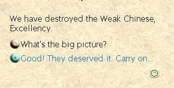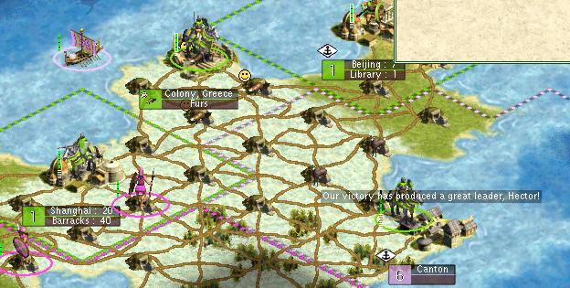 Each caravel has 3 knights on board, which unfortunately is the maximum that they can carry. I'll be interested to see if anyone invaded another continent using Great Lighthouse-enhanced galleys; that would be difficult logistically but certainly possible. Well, in any case the armada landed in China in 1285AD and their cities began falling like dominoes. China and France had apparently been at war for most of the game, and as a result they were way behind me in tech and had few forces. My knights laughed at Chinese spears and archers while almost casually ripping through their core cities. Beijing fell in 1290AD, Shangahi in 1295AD, Canton in 1305AD. Those were the only three Chinese core cities, though they had many others out to the west on a series of islands. France had appareantly taken Nanking and Tsingtao from them at some point earlier in the game; Mao was in bad shape even before I entered the picture. And more good news: in capturing Canton in 1305AD, I had the fortune to see leader #6 pop out!