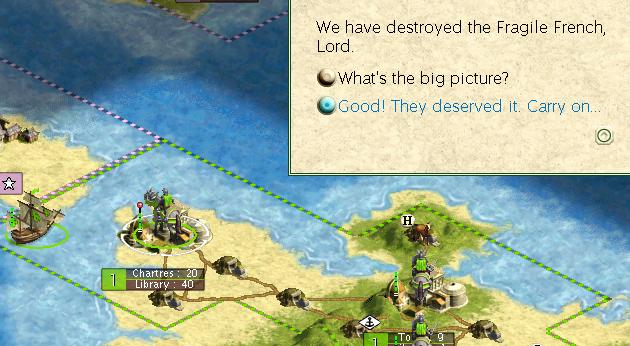 It had been a big turn all around for me. In 1405AD I captured Tours and reduced France to their last city. At the same time on the other side of the world, I captured both Samaria and Tarsus from Persia, leaving them with only 2 cities left on their southern island. On the very next turn, I was able to reach Chartres as well, prompting this message: