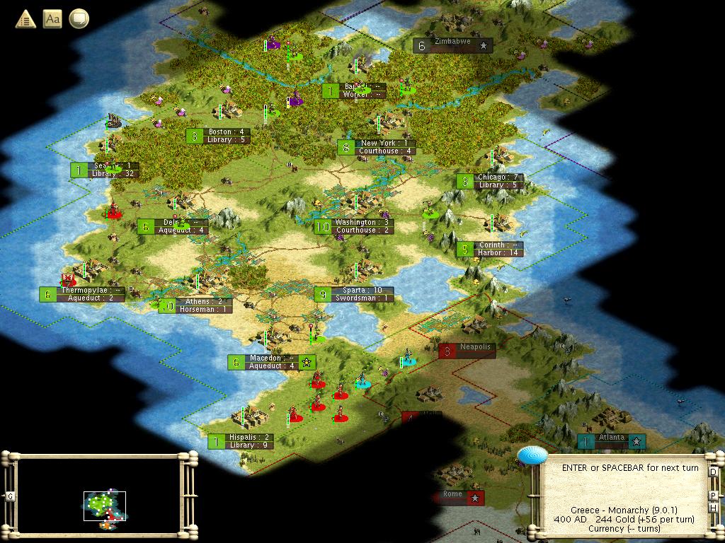 540AD was a black day in the history of the Macedonians. Despite the presence of city walls and a barracks, my 13hp hoplite army was killed by a couple of Roman legionaries and Hispalis was retaken. This was nothing other than simply horrendous luck; one legion took 9hp off my army. NINE! And it was 3att versus 6def... but enough of dwelling on the bad news. I vowed to retake Hispalis ASAP, though the city walls I had put in there made it more difficult. This was balanced somewhat by the progress of the northern forces, which captured Zimbabwe in 560AD. By this point, the Zulus and Indians were all but dead, being unable to muster more than an archer every 4 or 5 turns. I began pushing them harder to make the struggle on the continent come down to only one front, with the consequence that my offensive stalled somewhat in the south. Such is life.