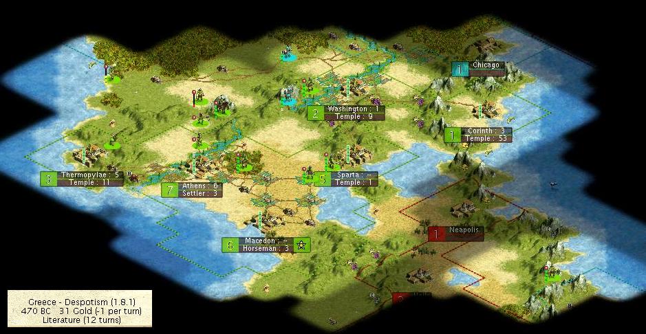 I moved towards Philadelphia a couple of turns later. My column of swords punched through the city's defenses and took it in 510BC, but took such heavy losses than only a 1hp sword remained to guard it. It was retaken by the Americans as a result on the next turn, and I took it back again (auto-razing it now that it was size 1) in 490BC. That wasn't such a bad thing; Phillie was in an awkward place compared to Athens and my replacement city was put in a better location. I took another picture just after this, in 470BC: