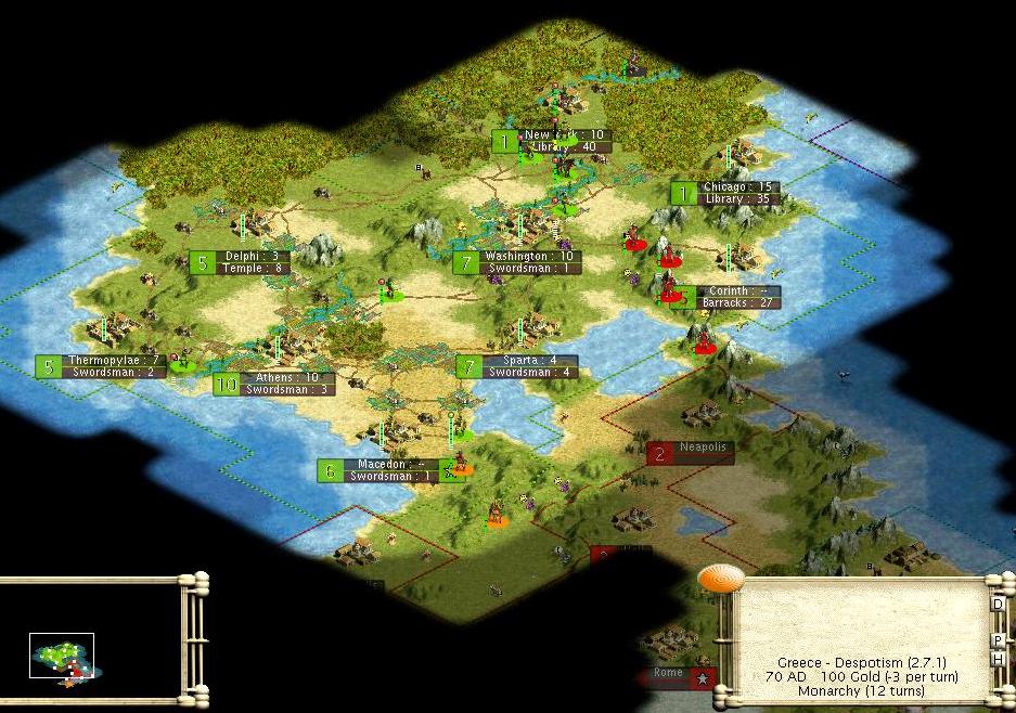 This screenshot shows more progress again, as I have expanded another city-length up my continent. Delphi was the replacement city for Philadelphia, which had grown into a fairly productive city by this point. Chicago was another fishing village captured from America at some point in the past; I didn't mention the date in my notes, as it wasn't a very big deal. I continued to get English and Roman units down by Macedon, but now Rome irritated me further by sending spears up near Corinth and keeping them on the mountains where they were almost impossible to dislodge. I ended this eventually by putting an elite hoplite on the gold mountain chokepoint tile. Fighting the Zulus and Indians in the north was a bit tougher due to all of the jungle, and I lost most of my units there at this time. My cities are all working on swords at this time to go after the remaining American holdings in the north.