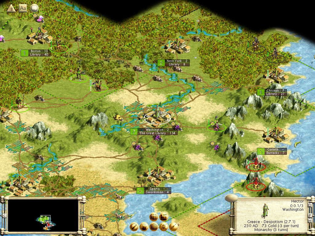 Athens is clearly working on a settler to fill in all of that opened up space. You can also see that I have a sword walking around in the bottom-right corner of the map; I kept him on the mountains and scouted out a pretty large area because no Roman or English units would attack him. Eventually though, a couple of archers ganged up on it and killed it. Also note that of my six cities, only one is building a military unit. I spent a lot of time building up my infrastructure in this game, often just trying to hold the front lines while working on buildings in each city. It won't be until the reports are in that I'll be able to conclude whether this was a wise move or not. But in any case, it should be clear that I was slowly moving forward and expanding my reach, at the expense of America.