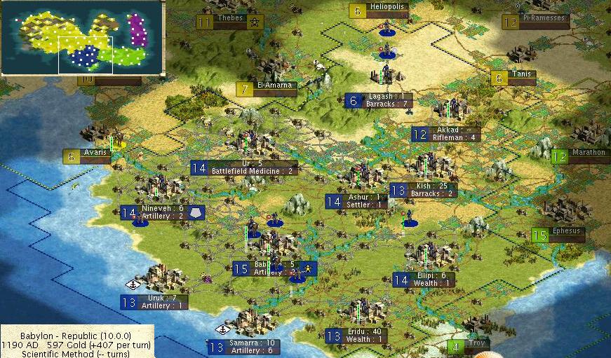 Things are under control at this point. The invasion of Egypt saw my northernmost city razed and by my count about 50-60 cavalry moved into my territory around Nineveh. A human would have simply gathered those units into a stack and THEN sneak attacked, but due to the stupid way that the AI declares war only two cavs actually attacked Nineveh and my conscript rifle thus survived and kept the city from falling on that first turn. Why Cleo didn't simply take the undefended Uruk with her ROP rape is beyond me; that would prove to be critical later on.