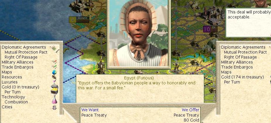 Peace achieved in 1265AD for 80g. I survived. Barely. Uruk was ruined from bombardment and the draft, and contained all of 5 rifles, 1 cavalry, and 1 artillery at the time of peace. Ironically, it was the fact that Egypt had converted over from fast cavs to slow infantry on the attack that allowed me to survive. But I was alive damn it, and it felt really really good indeed. One city with a handful of defenders survived for almost 10 turns against two Deity AI civs that stretched across the entire map. And they did - not - pass through the gates of Uruk. My continued existence was a slap in the face to Cleo and Alex; maybe I didn't have a shot to win, but I wasn't out of this game yet, and I wasn't going to quit until someone else put me out of it.