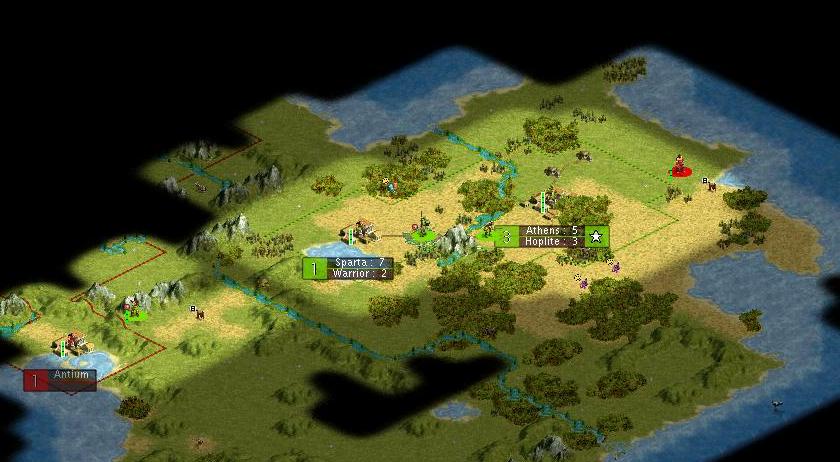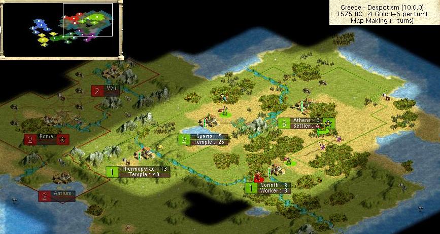Those mined grasslands were bonus ones, the sort of balanced starting position I would expect a map that Sirian tinkered with to generate. Notice that although I have a game forest within range of my capital, I can't benefit from its extra food under despotism, where even chopping down the forest and irrigating the plains tile would give me 3 food -> 2 food under the starting government. So until I became a Republic or Monarchy, I wouldn't have any food bonuses in my capital - and by that time, the landgrab would be over. It certainly wasn't a bad position of course, as there were both wines and furs within easy reach of Athens (the furs are just to the west in this cropped screenshot). The land around me was quite fertile, and I quickly found that there was coast to my north and east. It seemed that my opponents would lie to the south and west.