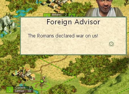 The Romans sneak-attacked me at Delphi in 775BC, attacking the defending regular warrior with their own regular warrior and winning. Delphi was the only city of mine without a hoplite for defense, and there was one on the way at the time. Seems the AI really does do a good job of taking advantage of cities with poor defense. Why Delphi? It had a dyes luxury, but the AI civs don't go after luxuries like that very often. No, this attack meant that Delphi had a future resource that Caesar wanted to claim (and sure enough, there was coal there later on). So I suddenly found myself down a city and at war with my closest neighbor, at a time when my landgrabbing was only about 70% complete. Considerations of the tech pace went out the window. Things were about to get "interesting"!