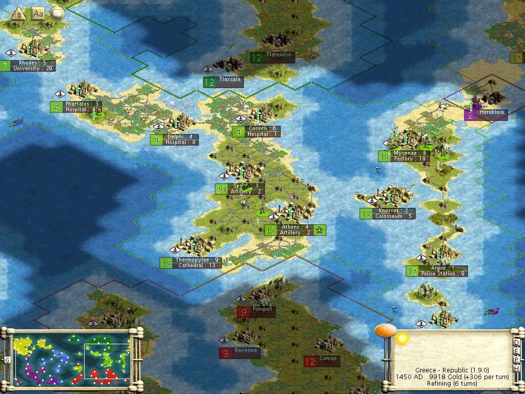 Smith's was built in Athens in 1335AD; I love it when the AI civs ignore those optional wonders and they can be snagged up easily in the Industrial Age. This went nicely with Universal Suffrage, which completed in 1385AD in Sparta. I have pictures for all of these but don't see much of a point to posting them. It's also late, and I want to finish this report and upload it ASAP, so no useless wonder pics today. The next wonder to be built was of course Theory of Evolution; I timed it to complete on the same turn that I discovered Steel and thus pulled three techs in one turn (1450AD), not too shabby! Too bad there were no rivers anywhere in my territory to build Hoover's... but wait, my faraway gems colony surrounded by Roman cities has a river in its 21 tile radius. Why not build Hoover's there, as there are almost no rivers on this map? It was an idea that was just crazy enough to work.