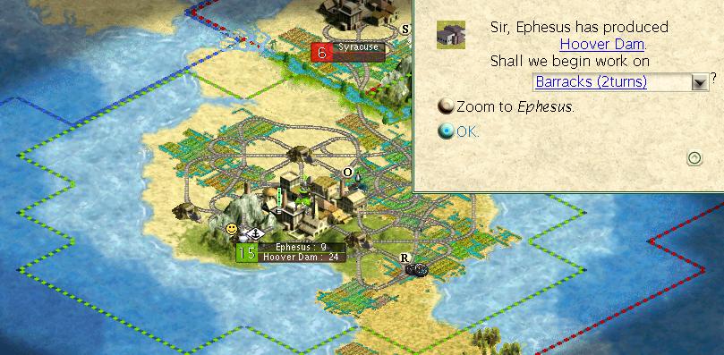It took over 30 turns to build Hoover there but still got it, so the AI competition was not exactly fierce. Of course I was also well ahead in tech by this point, so there was never even a chance for anyone else to start Hoover's. I got all of one free power plant from it, but the feeling of sastisfaction was priceless.