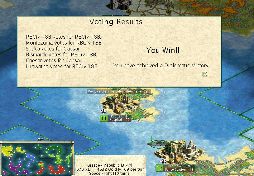 Well, the UN finished as scheduled in 1670AD and I naturally held the vote, having buttered up the other leaders the turn before with lots of nice presents. The result: