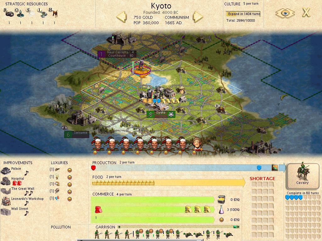 Kyoto was one of the greatest cities in the world, boasting two wonders and a size of 24 before the war started. Now look at it: every city improvement destroyed, the population so whipped and drafted into the ground that every worker has to be changed into an entertainer, starving to death even as we speak. What a sad sight to behold. I couldn't help but think of a real-world comparison to Berlin in the final days of WWII, a city literally falling apart under the stress of war. Well, in any case, I took the city on the same turn in 1665AD: