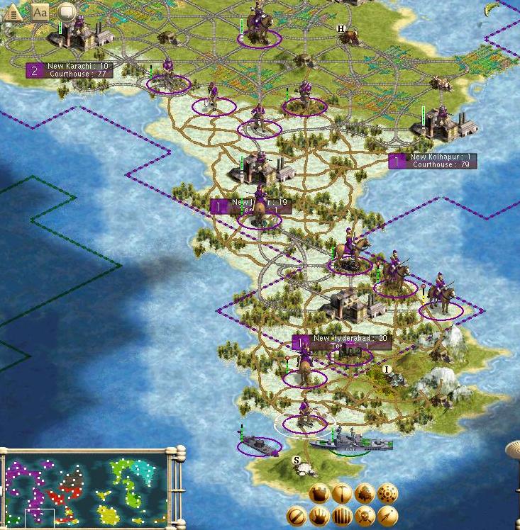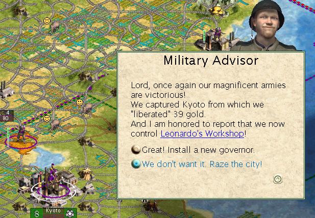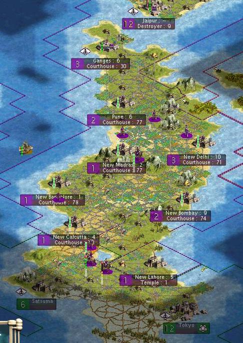 By this time, the Japanese navy was non-existent and I had complete control of the seas near my borders. It took me 165 years, or 33 turns to take the first city from Japan, but the pace sped up rapidly after that. The techinique was the same in each case: I would raze a Japanese city, replace it with one of my own, rush a temple and library in the city to get the cultural border to expand, and then use the new borders to move my artillery and cavalry into an easy range to attack. I had some good luck too in this war; one of the few cases that stands out in my memory as having good combat luck. My cavalry were routinely able to take out conscript infantry, which is definitely not the way the odds go. In any case, things moved along rapidly.