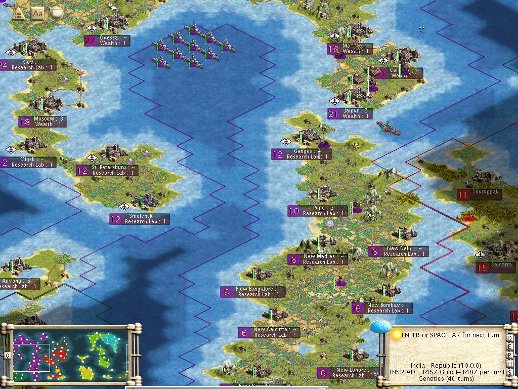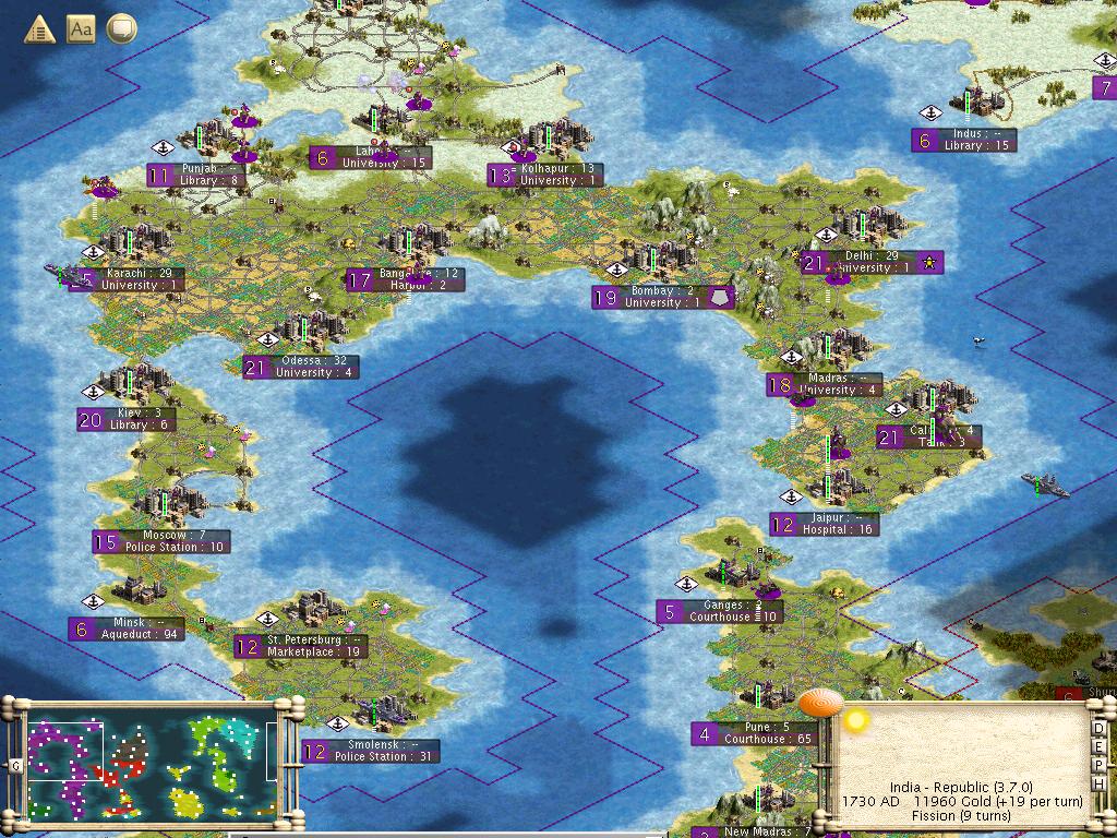 My research time was initially awful; it took me 12 turns to research Fission, since I had no libraries and not enough income to go 100% science. However, as my core cities produced the key research buildings, the time to research kept going down. I traded a few of my new techs away to the other civs for massive cash payments, which slowed down their research efforts and allowed me to go 100% science. Persia, a civ with whom I had had very little contact with the whole game, was my primary adversary in this regard. Along the way, I made sure to pick up a little something to ensure I wouldn't lose the game: