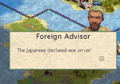 No warning, no threats, no hint that anything was coming at all, just a flat-out declaration of war. They clearly had this planned, because 8 cavalry landed on my Russian island city of Sverdolovsk the turn that war was declared. I thought that I could ride out war for a while and then settle for a peace, but Tokugawa crossed the line when he captured Sverdolovsk and RAZED it to the ground. Those were *MY* people in there! Ignore the Russian name, because the citizens were all of Indian nationality. That crossed the line. If he wanted a war, then he would get it. Of course, Japan was the strongest civ in the game...