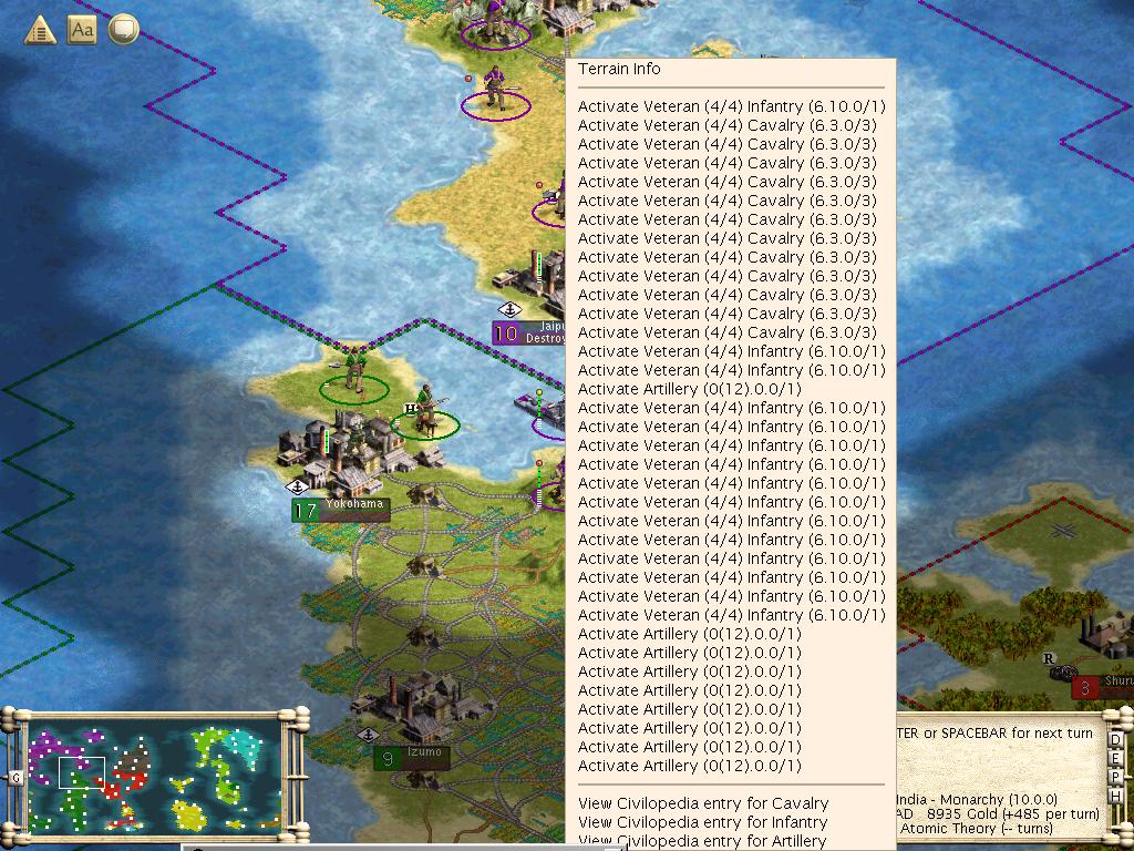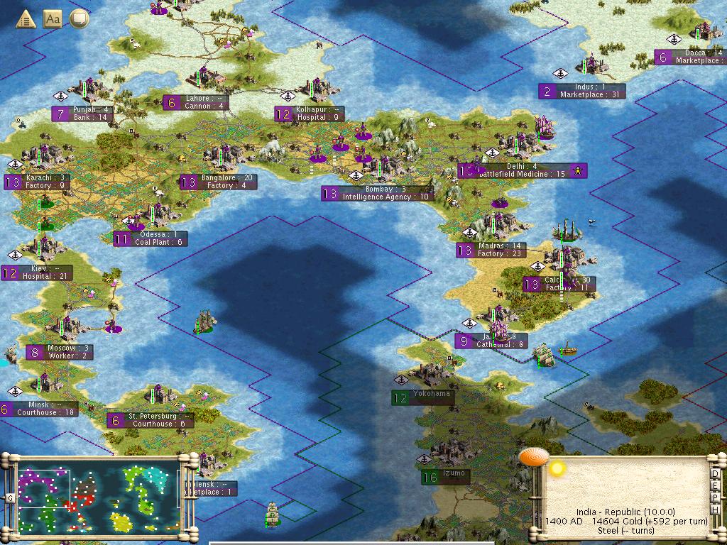 The early phase of this was was mostly naval. The Japanese had the largest fleet in the world, and I had no ships worth mentioning. If you look at the 1400AD picture, you'll see I have over 14,000 gold stored up. I was saving it for use in an emergency situation. Well, this qualified as an emergency situation! I rushed lots of ironclads in Jaipur and Calcutta to do battle with Japanese Frigates and Galleons. The sea outside of Yokohama and Jaipur became a veritable graveyard, as dozens of ships died there. I sunk at least three galleons (presumable full of riflemen or cavalry) that were headed for my tundra colonies. As it was, the Japanese landed 5 rifles and 1 cavalry up there; fortunately I had seen it coming and those cities had seen a bunch of rifles rushed for defense. None of the three cities up there were ever lost.