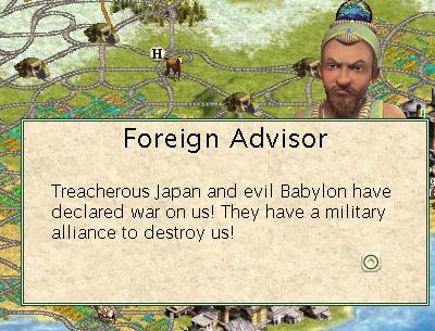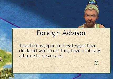 These came in 1485 and 1495AD, respectively. Now neither of these civs was strong enough to threaten me, but what was the deal, really? Since I've never seen this before when dominating the power bar (Japan and I were far ahead of everyone else), I have to conclude it was another result of breaking a deal earlier. That seems like an unfairly harsh penality for breaking one deal; keep in mind that the AI civs were breaking trade agreements with ME by signing these alliances. In any case, although I never declared war on ANYONE the whole game, I now had everyone permanently furious with me at all times (*sigh*). The F4 foreign advisor screen was pretty funny at this time - take a look:
