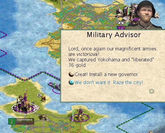 I chose to raze the city, as I would do to ALL Japanese cities as an act of revenge for their burning of Sverdolovsk. They started the war on their terms, but I would end it on mine. They were going to pay a price for starting the war and organizing alliances against me, and it was going to be on their own home turf now.