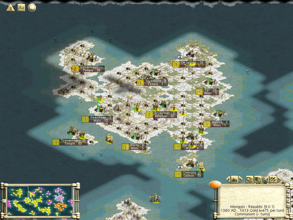 The first task was to gain control of the seas and capture the Scandanavian overseas colonies before moving in force on the Viking homeland. Ereen was easily recaptured in 1380AD from the warrior that they had defending it. Alesun, another island colony, became the first Scandanavian city to fall in 1395AD. All this time, I was rushing galleons out of cities with harbors to provide transportation for my cavalry. I also traded for Steam Power with France in the same year, getting it for no more than 4 luxuries and saltpeter. Now I could rush out ironclads as well to sink the Scandanavian frigates bombarding my shores; I had already resolved that as part of the "roleplaying" aspect of the Mongols I would never use any bombardment units. That meant that my cavalry would have to charge into the teeth of the enemy cities, and that my ships could not use their bombardment capabilities to attack; only full speed front assaults on the high seas would be allowed. As I got more and more ironclads into the water, the naval battles increasingly swung in my favor.