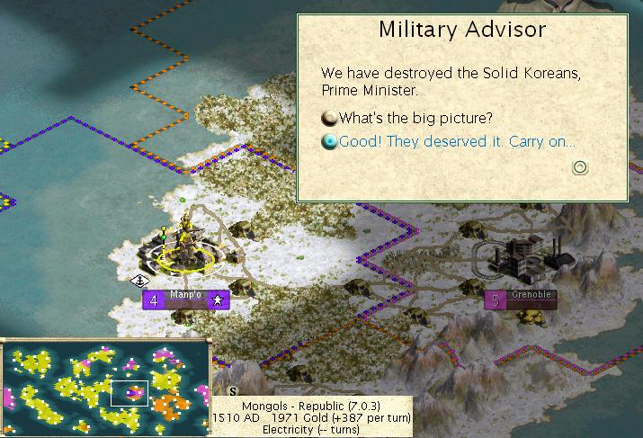 At the end of my turn in 1515AD, I was NOT at war for the first time since 860AD, and really the first time at peace since 570AD except for five turns of peace between 810-860AD. All my war weariness disappeared, and my approval rating went from 60% (at 30% luxuries) to 98% with 0% luxuries. Not too shabby! We love the Ghengis Khan days were celebrated everywhere. But I still hadn't won the game, so I needed to initiate another war. It's your turn next Joanie; before the 1520AD turn had ended, I was once again at war with one of the final two civs remaining in the game.