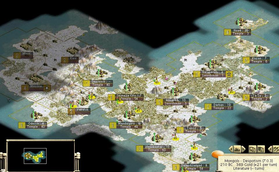 The next few turns were pretty uneventful. Long-delayed infrastructure projects were completed in some of my core cities while Karakorum produced a number of settlers to repopulate the jungles. In 530BC I got a message saying that the Vikings had completed the Oracle - Ragnar was a busy little boy whereever he was. A century later in 430BC, almost half of the Russian cities had been rebuilt, several times by founding a city on the exact spot where the razed one had once sat. Unfortunately, in 390BC Russia founded Yakutsk on the spot of the old St. Petersburg when my attempts to block their settler failed as a result of a misclicked move. No big deal; I could always capture it back in the next conflict.