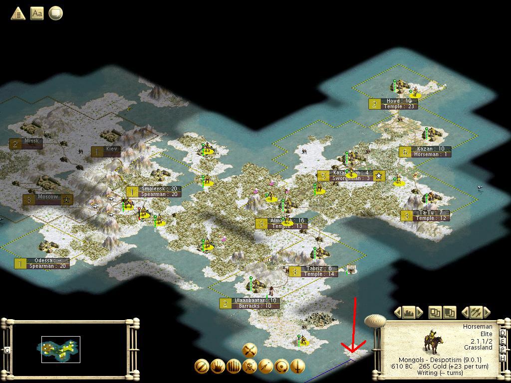 One of the nice things about the PTW expansion is the ruins that form whenever you raze a city. As a result, the locations of the Russian cities that I captured and were autorazed can be seen very nicely in the above picture. My new cities of Smolensk and Odessa also gave me complete control of all land east of the mountains that ran across the continent just to the west of the chokepoint, as well as a gateway to Moscow on their other side. My goal for peace should be pretty obvious: fill in all of the open territory with my own cities to ensure that Russia would never regain any kind of power. I've also indicated a foreign border to the south across the sea with a large red arrow. I fortified a sword on the southernmost part of my continent hoping to make contact as soon as possible, but without Map Making I could not go there and find the other civ myself. From the blue border, it appeared to be Germany down there, and I wasn't sure I wanted contact with the aggressive Bismarck this early in the game either.
