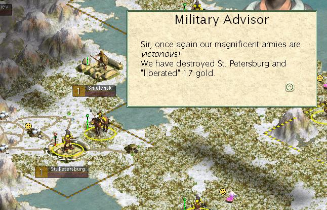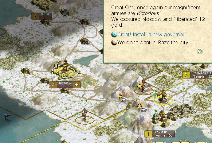 The next few turns were spent dueling it out with the few Russian swords that Catherine possessed, who immediately came after me over the mountains. If they had been smart, they would have fortified there and presented a formidable obstacle to my advancement towards Moscow. Instead, they foolishly came down onto the grassland and hills next to Yakutsk, where they were killed (with losses) by my own swords. In 150BC though, I set out my stack of swords towards Moscow, which arrived there a few turns later. The battle for the capital went badly, with a number of vet swords losing to regular spears. I managed to capture the city with a single hit point left on my last sword that could attack - whew! That was a close one!