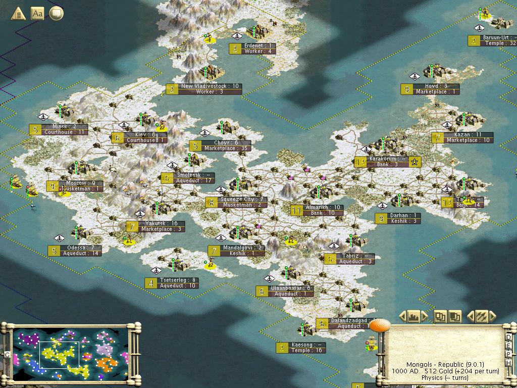 Again, it was an easy choice to decide what to do with Chagati. I traded for Economics and rushed Smith's Trading Company right there in Konigsberg. That wonder is even more powerful in PTW than in regular Civ3, since it also covers the costs of stock exchanges and commercial docks. It added a good 50gpt back to my income, a pleasant thing to make up for the lack of Wall Street now that stock exchanges rather than banks are needed to build it. I would keep rushing wonders with my leaders until there were none available, then I would use any that I got to form an army.