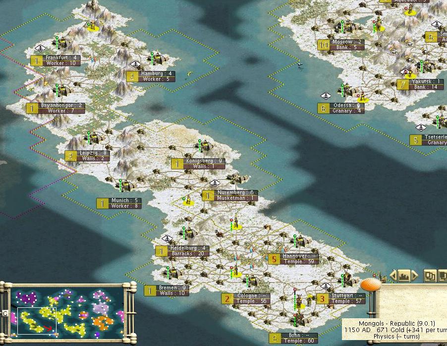 I won a battle with that army in 1150AD, opening up the possibility for the Heroic Epic (begun right away in Karakorum). Led by my glorious army, the city of Bonn was captured and all of sudden Germany was gone from their starting continent. It had taken a little bit more than twenty turns, but Otto was reduced like Wang Kon to a series of weak and isolated island colonies. Since three of his cities were in nearby reach, I did not make peace but instead began ferrying over half of my forces to the island, with the other half heading north to prepare for the Iroquois campaign. Here's a shot of what Germany looked like after the Mongol hordes were done with it: