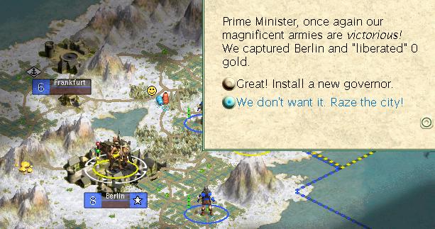 By 910AD, I had rounded up enough units for the first assault, and so three caravels carried nine keshiks across the sea to Germany, landing there on the next turn. Once again, the opposing civ was caught unprepared and I faced no counter-attacks upon landing. Hamburg was captured in 930AD, and I was unusually lucky in that it contained both a barracks for healing and a harbor to import my luxuries. What a great forward base for my army - as long as it didn't flip, that is. Keshiks continued arriving in a steady stream, and within a few more turns I had almost twenty of them over on mainland Germany. Once I felt that I had enough, I gathered a bunch of them and set out for Berlin. Bismarck had a number of pikes in his capital, but not nearly enough to stop the massive force of keshiks I sent after it: