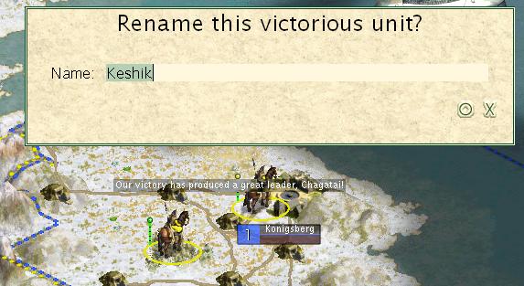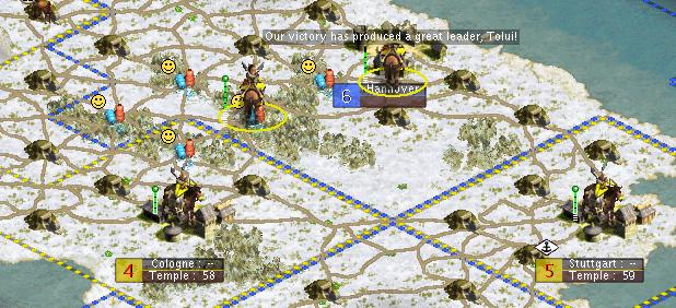 I had just recently traded for Banking when this picture was taken, which is why several of my cities are working on the things. Also notice that despite the fact that I was at war, only a few cities were working on military production. This was due to the fact that I already had sufficient forces to cripple Germany and needed only to replace the odd unit that I lost; if Bismarck had been stronger, I would have had to devote more cities to producing keshiks. The march of war rolled on, with Munich - and Germany's only iron supply - falling to my forces in 1020AD. They traded for more iron with England almost immediately, but that must have cost more resources that Germany could ill afford to lose. Konigsberg was captured in 1040AD, and in the fighting outside the city my third leader appeared!