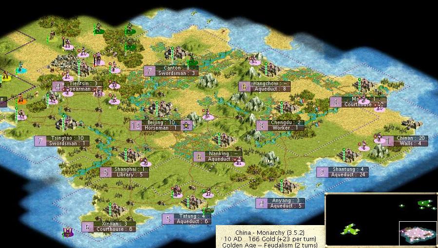 On the next turn, the combination of the Pyramids and the Great Wall sent me into an early golden age. Umm, as I had known it would, yeah. I should pay a little bit closer attention to what wonders I build in the future. This was actually a well-timed golden age, as I had already gotten into Monarchy and could use the shield bonuses to crank out badly-needed infrastructure in my new backline cities. Meanwhile, my 3-4 old cities would try to hold the line by themselves against the AI civs. Beijing hit 31 shields/turn in the Golden Age and was able to crank a horseman every single turn, which proved to be enormously helpful, as I would build swords/MDIs closer to the front. A word about combined arms here: at this stage in the game, I had to use a combination of swords, horses, and catapults to keep my losses down. You really have to use them in tandem to keep up with the fact that you are so badly outnumbered. First I would examine the front to see what units to use where that turn, under the main operating principle of "what can wait, should wait." Then cats moved and fired first, hopefully doing some important damage. After the cats went, I would then re-examine the situation, and decide where to attack with units. Swords attacked where they would not be exposed to counterattack in turn from the AI civs, horses would attack in a situation where they needed to attack and then move a second time. And of course you have to factor in workers to this equasion too, who can lay down the all-important roads and fortresses. All in all, each turn was like a puzzle waiting to be solved; it makes the turns take a very long time, but is certainly entertaining to play out!