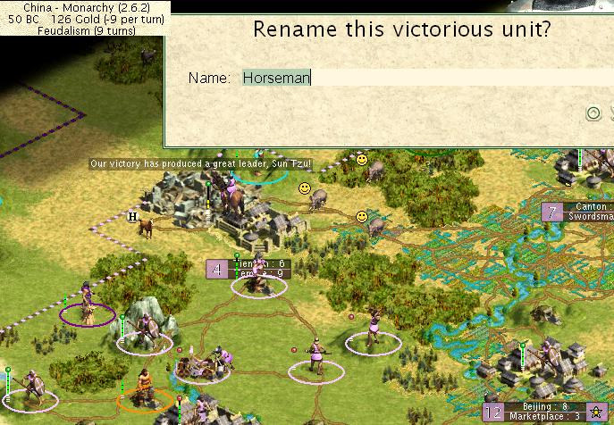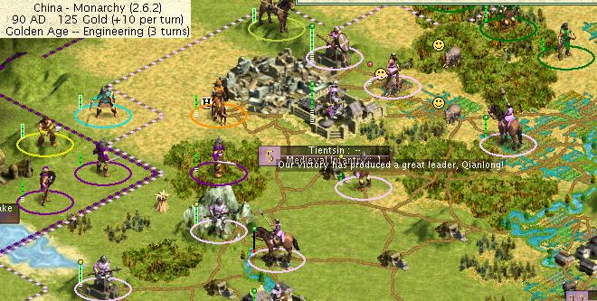 ...and returned back as the mighty hero Sir Sun Tzu! Remember this unit, he's going to figure prominently into the story later. Now there remained the question of what to use my second leader on. I initially thought to use him for Sun Tzu's, but Feudalism was still several turns away and I was pretty sure I could get another leader before the AI civs built up 600 shields. Looking at the list of available wonders, one of them immediately jumped out at me: the Great Wall! While the big wall is less than useful in most games, here in an Always War context it was enormously beneficial. With the Great Wall, any city walls I built would provide a full 100% defensive bonus to the units inside, just as good as a size 13+ city. And, playing as the Chinese here, could I really pass on the chance to build the Great Wall? It was an easy decision to make, and I rushed it in Tientsin - again to get a free cultural border expansion.