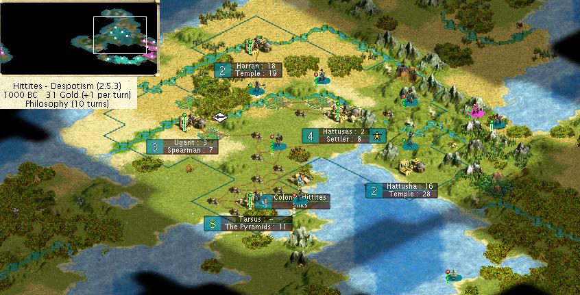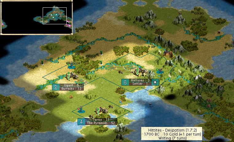 So I redouble my efforts at Tarsus. Hattusas produces a settler in 1425BC, then goes on to produce a continuous stream of workers to help Tarsus. I settle my fifth city in 1350BC, then don't settle my sixth until 750BC! In between, Hattusas is doing nothing but produce workers. Everything goes into THE PLAN. Expansion? Sacrificed on the altar of achieving THE PLAN. In other words, don't be surprised at how strange my game looks compared to some of the others.
