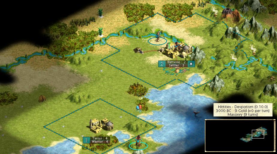 Hattusas produced its first settler in 2850BC (thanks to the disease) and then started in on its granary. This first city would produce military to protect the others from the barbs, who were starting to show up now on the edges of the blackness. In fact, there were barbs only 2 tiles from Ugarit when it was founded in 2710BC, not what you want to see when sending out your unescorted settler! Dodged a bullet there, that's for sure. Masonry was discovered in 2630BC and Tarsus started on the Pyramids the next turn in 2950BC, after finishing a second warrior for lack of anything else to build. That extra warrior would prove useful in fighting off the barbs though, so it wasn't a total waste. I was also really feeling the shields-poor start at the capital by this point as well; those hill tiles would be great down the line, but here in Despotism they were really hurting me. I ended up mixing a lot of workers between the settlers in Hattusas after its granary was built to mine those hills and get some extra 2-shield tiles beyond the bonus grassland and the mined plains tile.