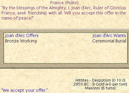 The very next turn in 2950BC, a French warrior popped up near me too. I didn't know it then, but these would be the two neighbors on my continent for the rest of the game. And what's this? Joanie has a trade to propose?