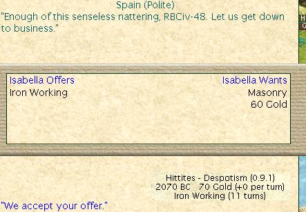 As you can see, Isabella offered me a nice trade for Iron Working as well, since she didn't want to be outdone by Joanie. What a dilemma for Mursillis, he has to choose between two sexy research assistants! I gladly made this deal, since I was still some distance away from Iron Working and wanted to get an early look at where the irons were. It turned out that there was a source to the west, about 2-3 city lengths from Hattusas; not particularly close, but I didn't see anyone beating me to the location. This confirmed the overall trend of westward expansion for my civ which had been going on since I sent my first scout in that direction, and then founded Tarsus to the west with the goody hut settler. Again, this would have large ramifications down the line that I didn't understand at the time - but we'll get to that later.