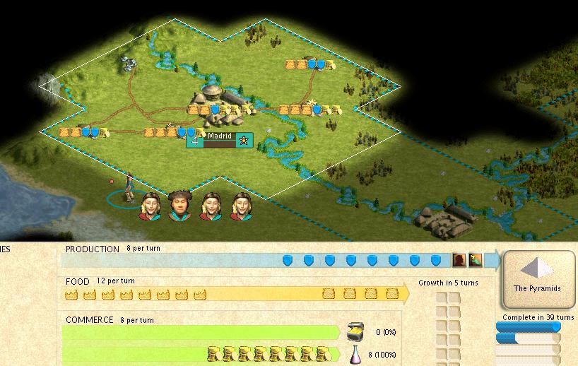 Oh this is not good. NOT GOOD. Madrid already has a lower ETA than Tarsus (which is at roughly 45 turns at this point), and it has no corruption, and it's still growing, and it has an iron hill tile to play with that it still isn't using.