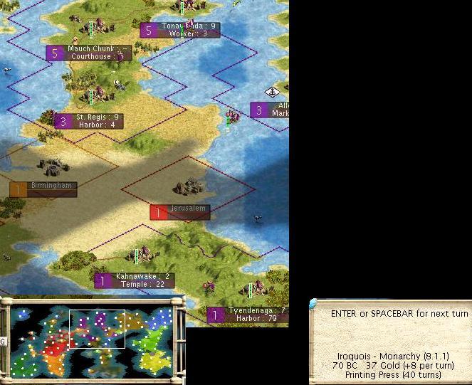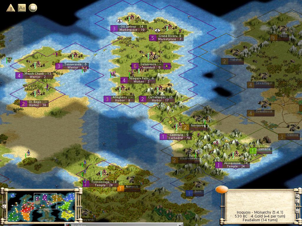 The Russian city of Novgorod is in control of the horses near the starting position. Their settler beat mine there by 2 turns; I had to settle for founding Centralia next to it. I thought I could steal the horses by cuture expansion, but the Russians rushed one of their cheap libraries (24 shields on Deity!) and stopped me. Akwesasne, the gem city, was a major coup for me; since the location is completely surrounded by mountains, I put a scout on the one open tile and stopped Russia from founding a city there. This allowed me to get the gems when the Russians really beat me to the site by a good 15 turns. I was rushing a temple in that city at the moment to prevent the Persian city of Samaria from stealing the gems by culture. I was successful in that respect, though it was a close call, as I found by diplomatically investigating the city.